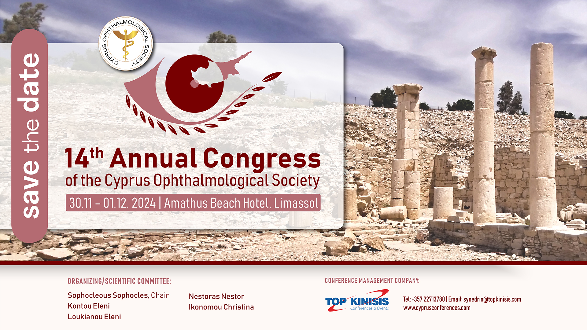 Welcome to the official page of 14th Annual Congress of the Cyprus Ophthalmological Society! We are delighted to host this event from November 30 to December 1, 2024, at Amathus Beach Hotel in Limassol. Join us for an enriching experience of knowledge-sharing, networking, and advancing the field of ophthalmology. We look forward to your participation in this prestigious event.
